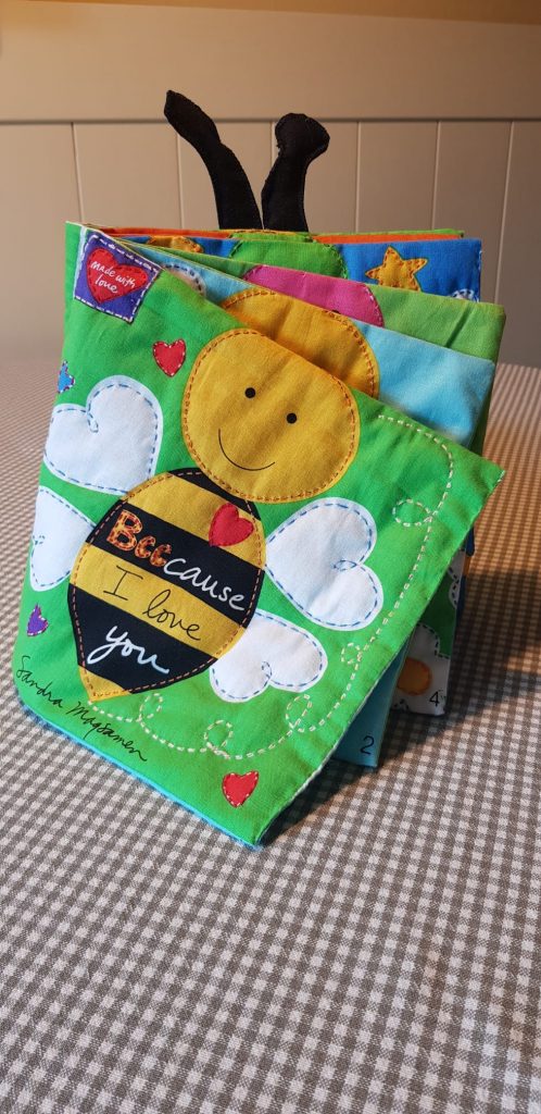 Rita ha cucito per il suo nipotino uno splendido libro, realizzato in stoffa che è la storia di un’ape. Particolare , colorato, genialissimo, è di sicuro effetto e richiede molta precisione!Penso che il piccolo abbia gradito molto…..