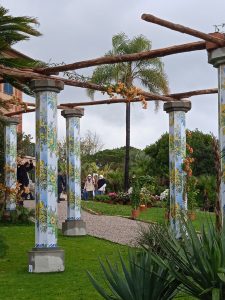 Scorgo una persiana alla genovese, inserita all’interno di una composizione floreale,la riproduzione di una costruzione rurale, tipica della Puglia e giochi di acqua s’innalzano tra un tripudio di fiori e alberi da frutto.