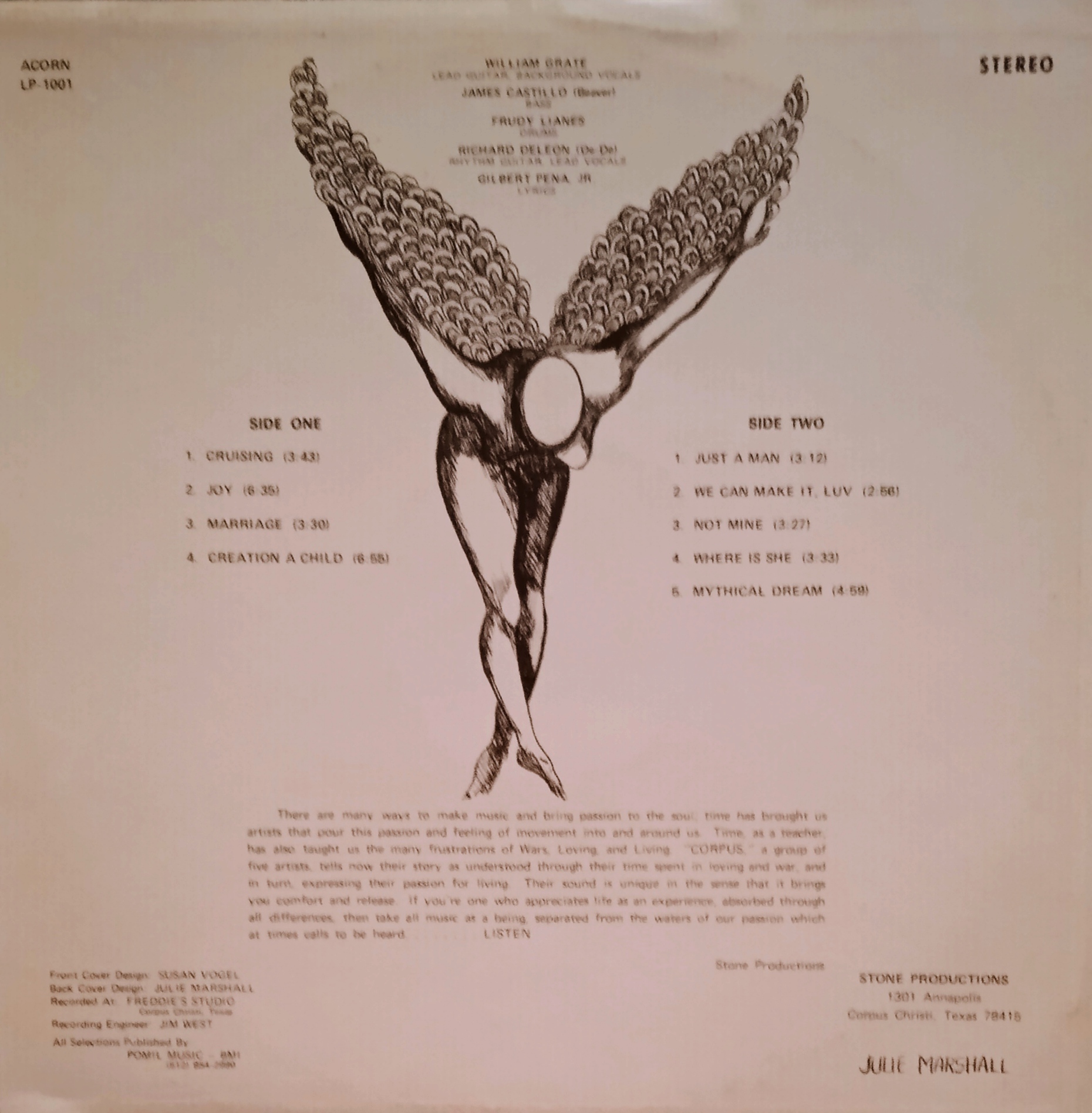 Un breve cenno merita la copertina da 5 stelle, creata da due artiste: davanti Susan Vogel e retro Julie Marshall, ottima tecnica a tratto bianco e nero. Metto il disco sul piatto e si parte con il lato A.“Cruising” è pura esplosione fuori dalla porta di casa, grande canzone nei top anni ’70, il testo classico on the road ed atmosfera blues con ottimi riff di chitarra solista. Come potrete notare dalla loro foto, forse l’unica in rete, la chitarra Les Paul nera di William Grate che domina il suono attraverso un amplificatore Traynor, mentre James Castillo suonava attraverso un amplificatore Sunn e Kustom con un basso Fender, il chitarrista ritmico Richard DeLeon ha suonato una Gibson SG rossa con P-90 con amplificatore acustico. Dimostrano molta abilità tecnica di registrazione a 8 tracce pur essendo una produzione locale. Seconda canzone è “Joy” sognante e lunatica, con chitarra solista dolorante direi il suono migliore per la mezzanotte che pochi album hanno il piacere di avere. Segue “Marriage” con un riff rocker di chitarra a due voci ed un buon testo. Chiude il lato A la canzone “Creation A Child”, lenta deliziosa e psichedelica, chitarra morbida e saltellante, per alzarsi nel puro rock.