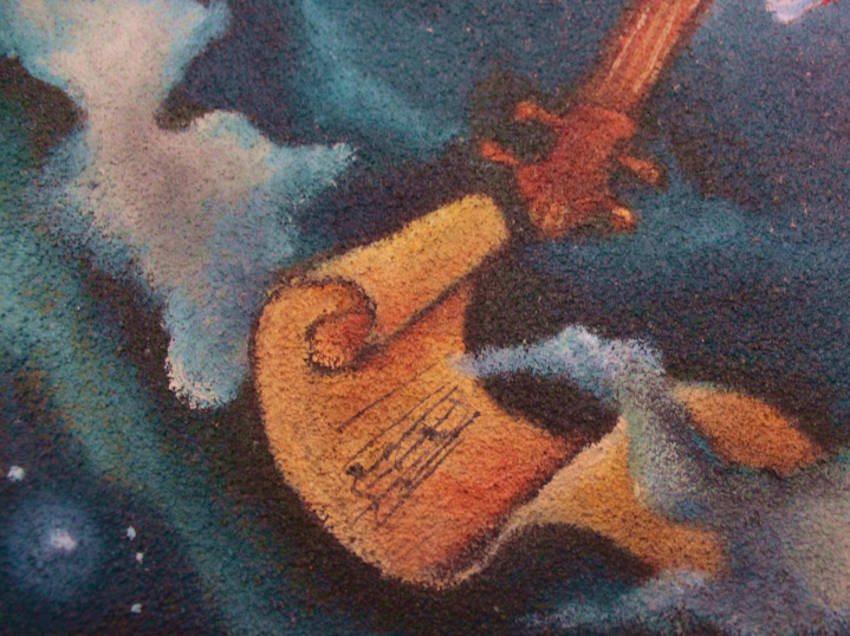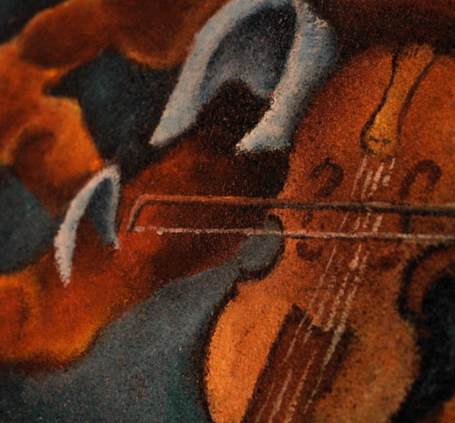Egli è curvo sul suo strumento, quell’arma che non uccide ,anzi emette sonorità vorticose ,donando forti emozioni… Lui con il suo violino o il suo violino con lui conducono fuori dal microcosmo indicando la via, ove mente e corpo, possono albergare nel macrocosmo.