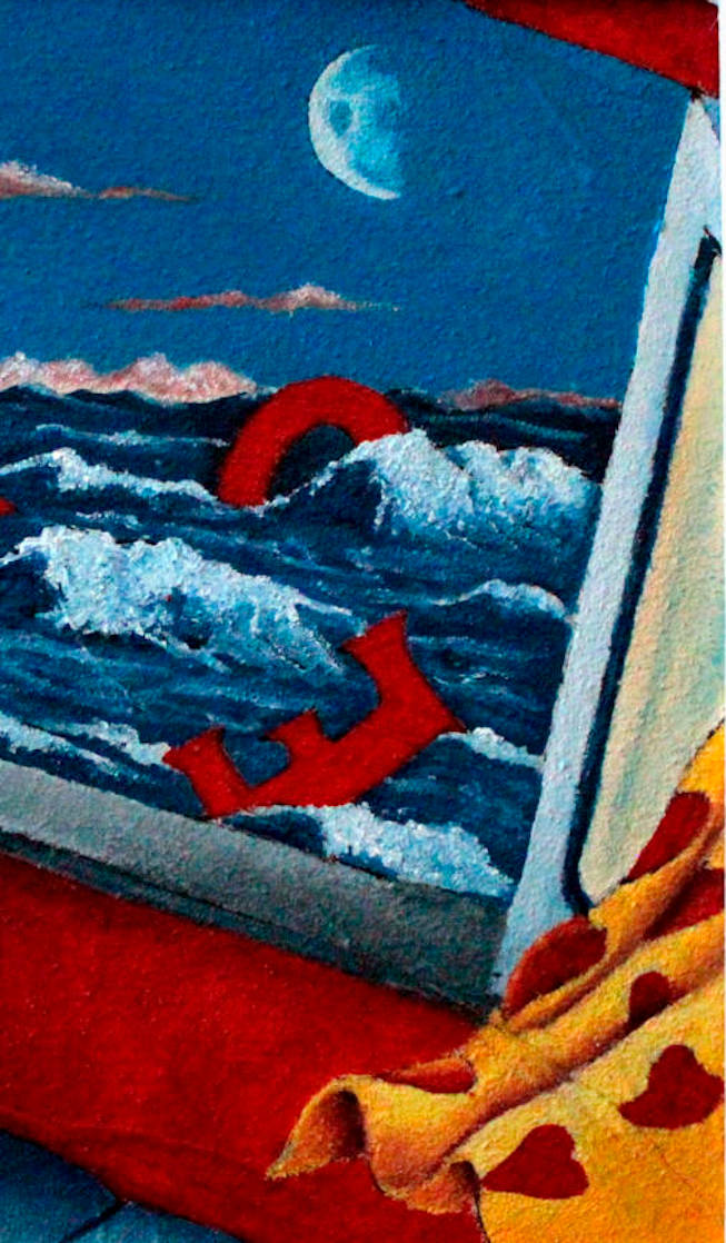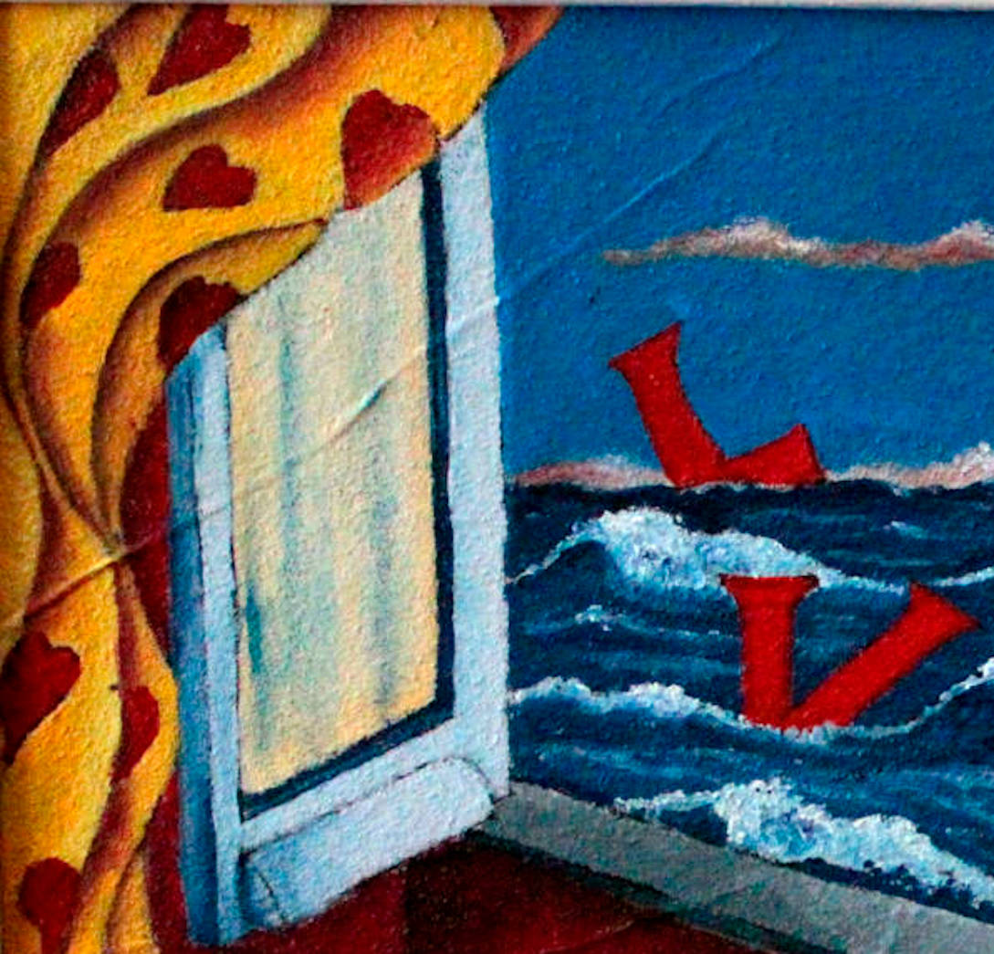 Il tramonto è prossimo e la luna inizia a prender luce dal fratello sole. Un mare agitato dal vento con onde spumeggianti gioca con le lettere della scritta “LOVE”. Amore che muore o Amore che nasce? A voi libero arbitrio… E’un amore che arriva da lontano ,trasportato dal mare, un amore lasciato sulla battigia ,per essere preso dalle onde del mare. Comunque sia parliamo di amore. Apriamo la finestra del nostro cuore e facciamo entrare nella nostra vita l’amore. Prima osserviamo ondeggiare sul mare assaporandone il suo profumo. Notasi le tende gialle con i cuori e la stanza affrescata di rosso… colore che ,per eccellenza, descrive l’amore. La song che accompagna l’opera è “Questi Posti Davanti al Mare” eseguita da un trio superlativo Ivano Alberto Fossati (suo il testo), Fabrizio De Andrè, Francesco De Gregori… Buona lettura ed ascolto. Opera disponibile presso il mio atelier. (AS)