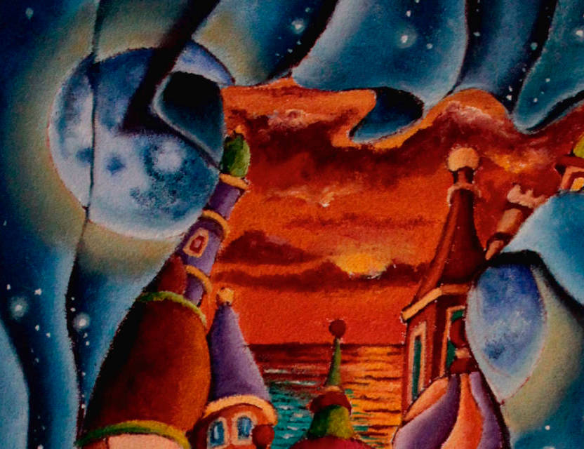 Era una notte di fine aprile del 2022 quando inizia a realizzare questo dipinto, che oggi presento nel blog Liguria Dinamic sulla pagina “Parliamo d’Arte”. Due notti prima ,un sogno mi propose uno scenario simile al dipinto “Il Sipario Notturno Accolse l’Alba”… Giuro, non avevo mangiato “pesante” né tanto meno cibi saturi di grassi e derivati, le mie cene sono molto frugali. Un indizio, da non sottovalutare, sono le mie letture prima di addormentarmi. In quel periodo stavo leggendo “Il Libro di Krishna (KRSNA)”, edizione The Bhaktivedanta Book Trust c lettura che consiglio a grandi e piccini.E’ un frammento per il nostro accrescimento spirituale e conoscitivo e se letto ai pargoli ,potrebbe loro insegnare molto ed accrescere la loro fantasia.