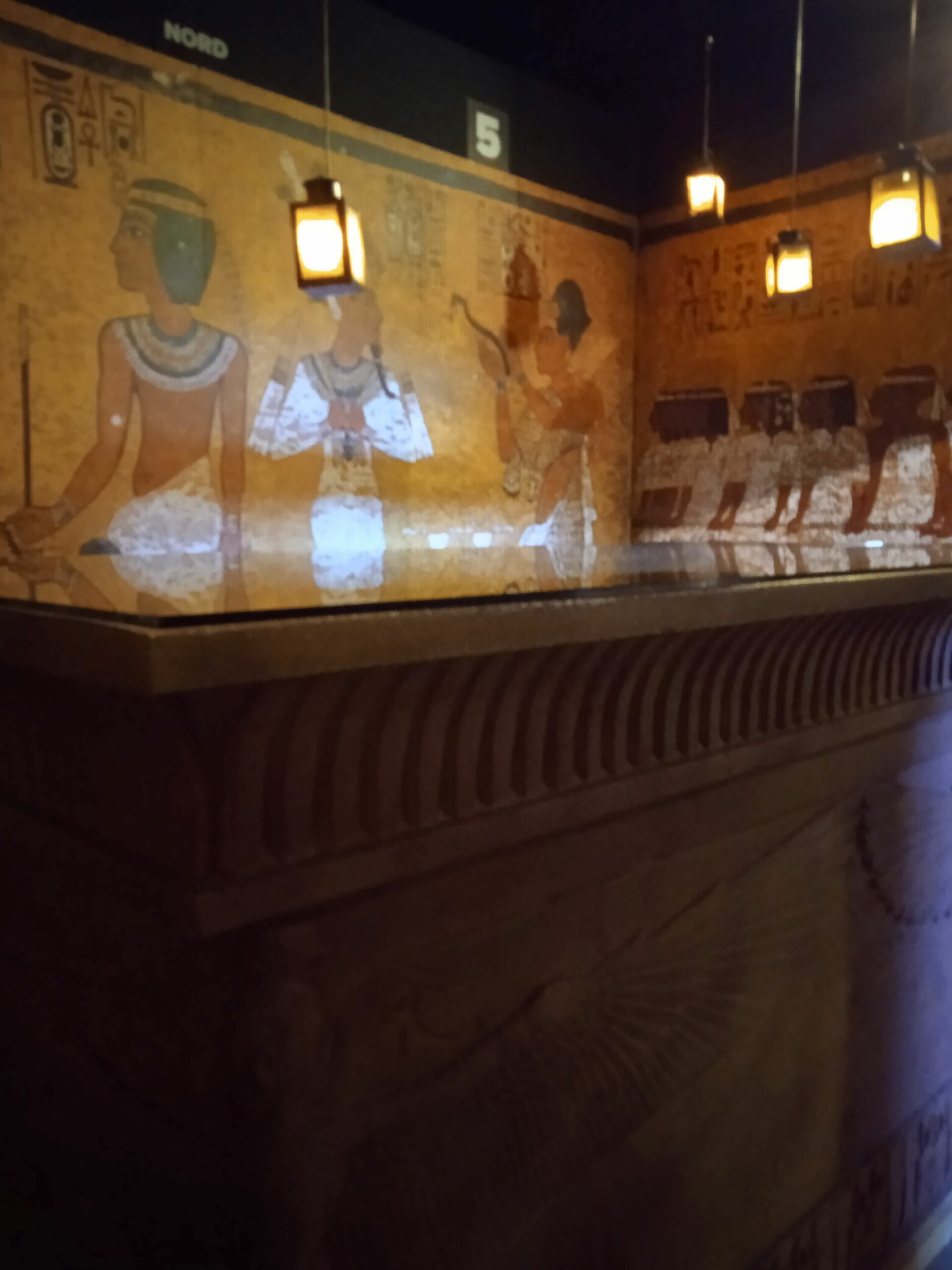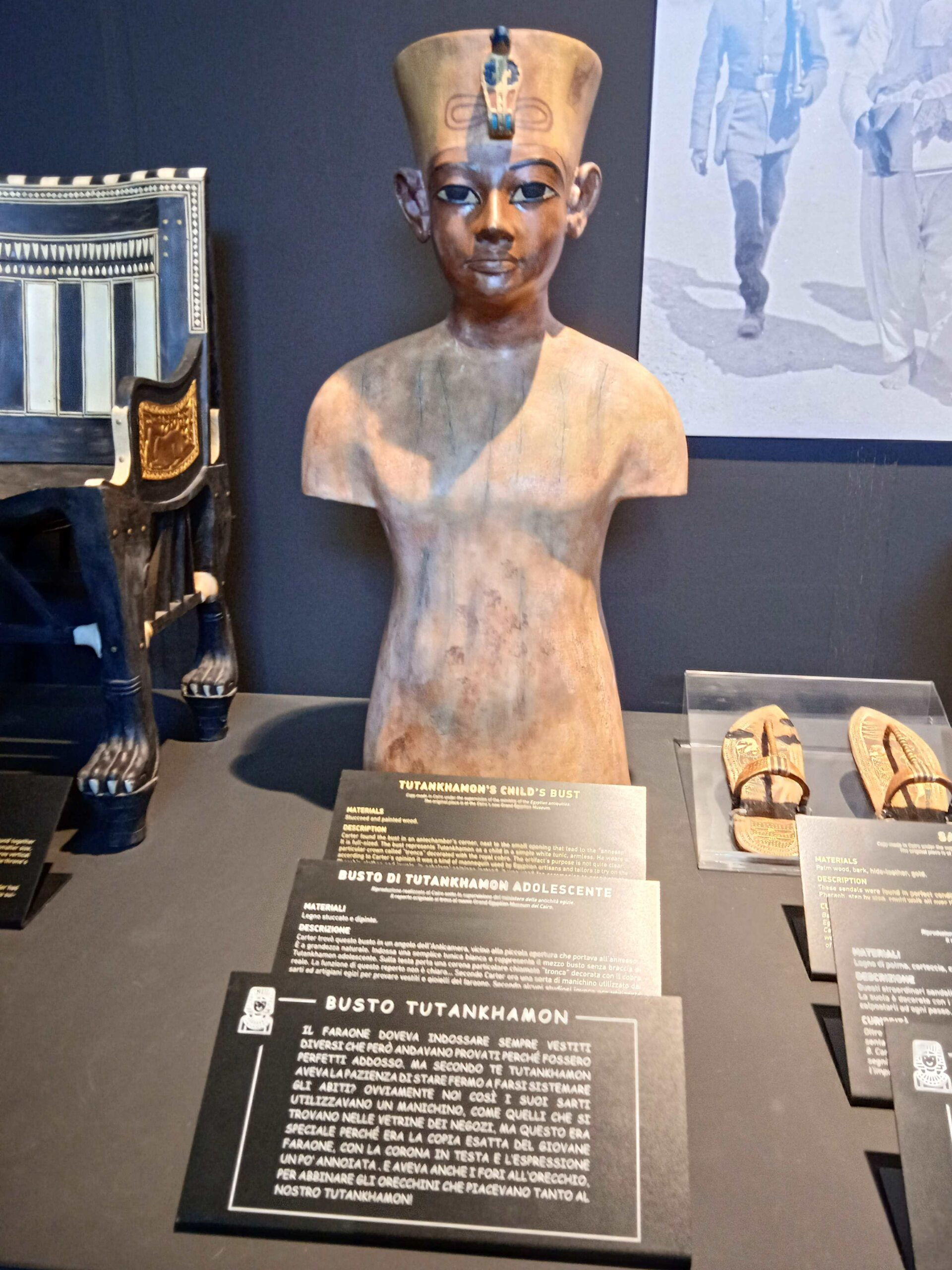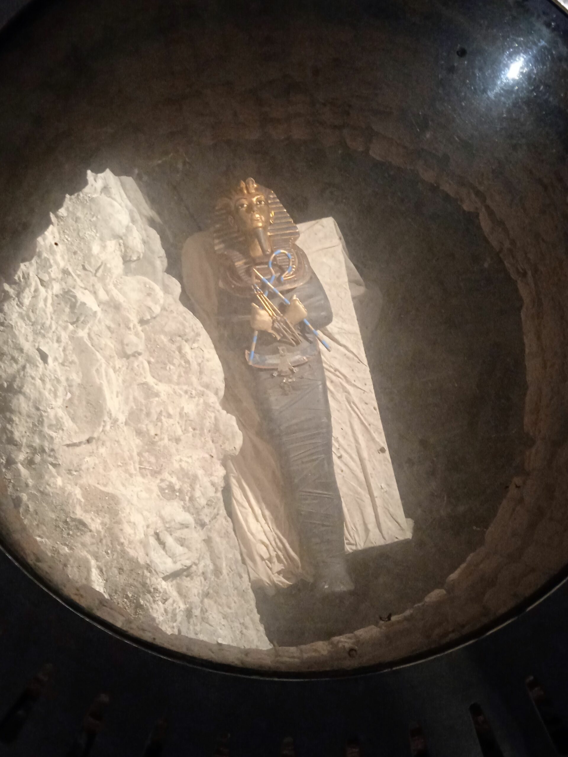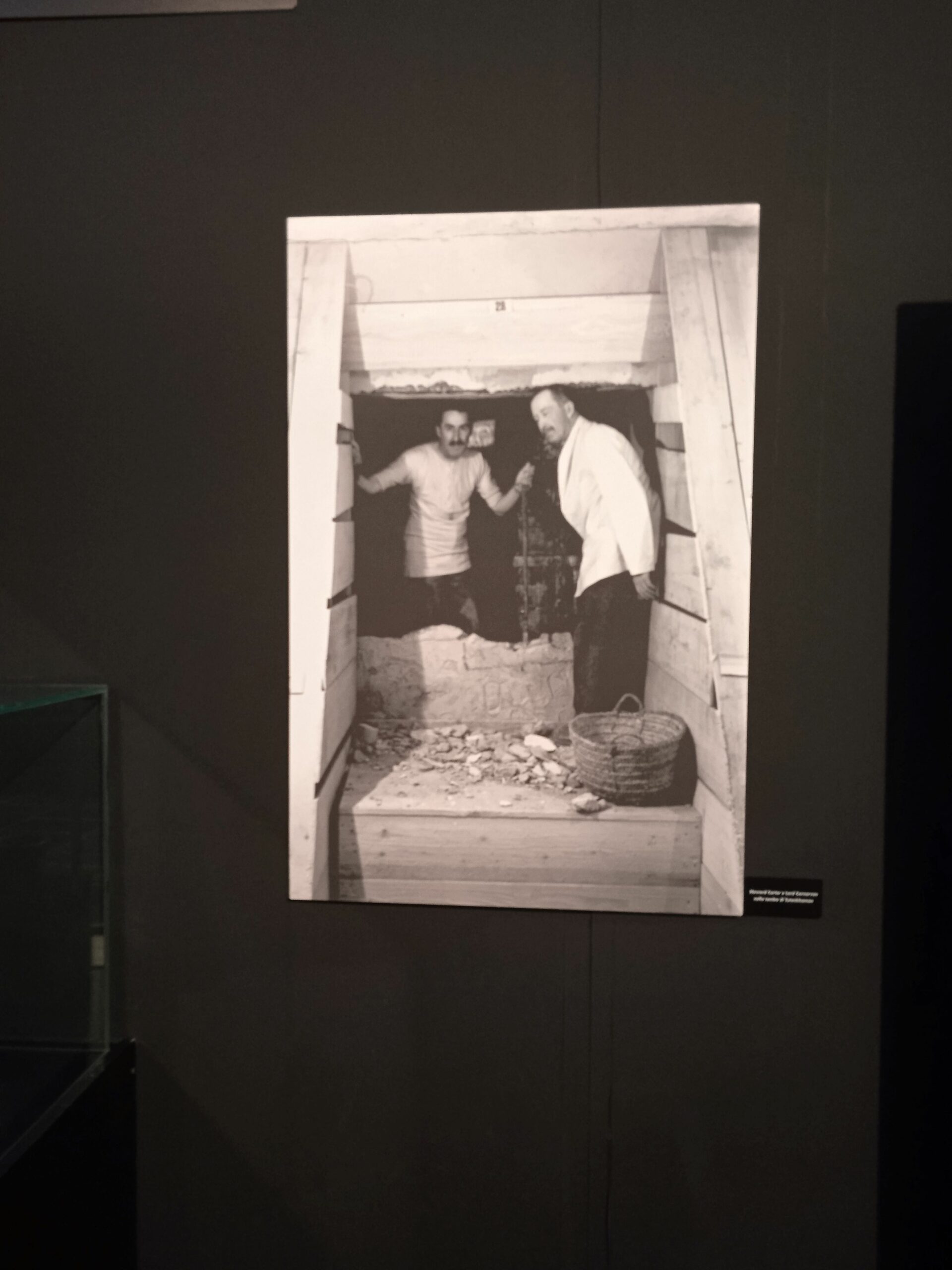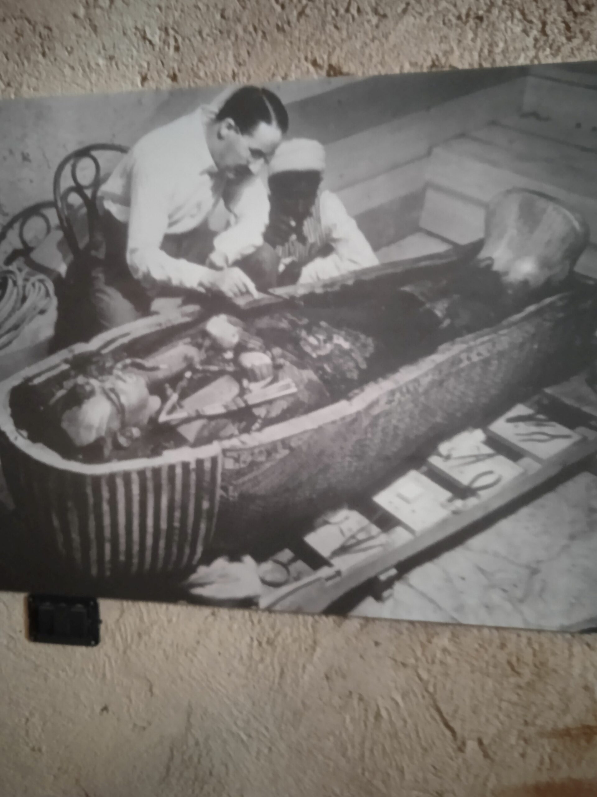Accanto al nuovo sono state affiancate le foto dell’epoca e puoi rivivere l’emozione provata da Carter , quando ha scoperto la tomba..Scendi infatti una scaletta e attraverso un’apertura , praticata a doc su una parete di legno, vedi esattamente quanto ha trovato!