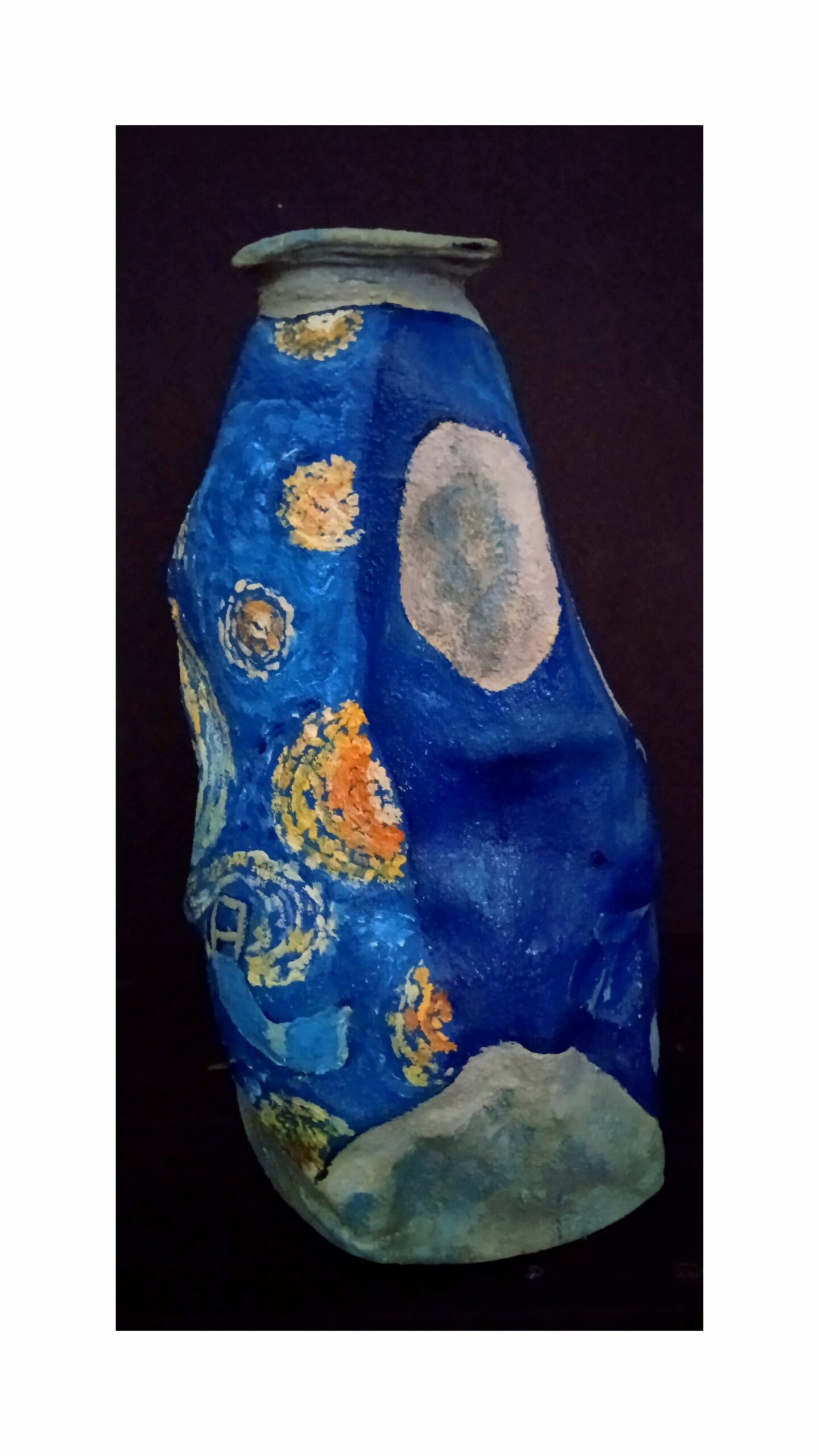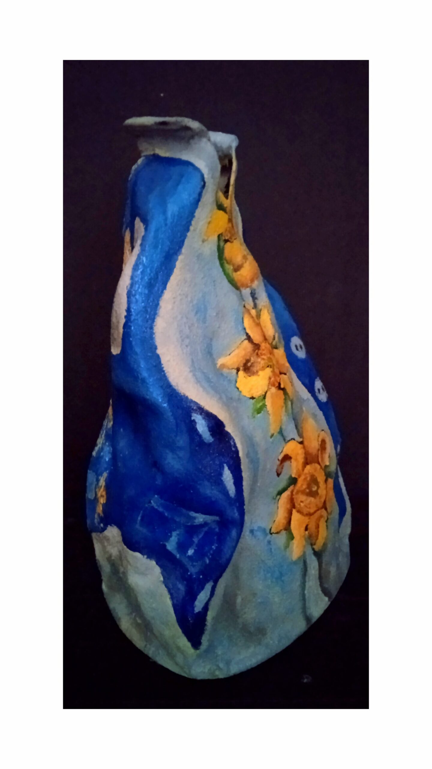 La KOSHA Sculpture, ovviamente in PET riciclato (tanica da 5 litri), dipinta ad olio e sabbia, ha una suddivisione particolare.La parte anteriore – panciotto aperto di colore blu primario/bianco/blu di prussia, permette di evidenziare i tre bottoni della camicia, che ho voluto dipingere a forma di girasole non statici ,ma in movimento, quel movimento tanto caro al Maestro. Una particolarità e curiosità …la passata estate avevo seminato alcuni girasoli nel terreno, attiguo alla mia casa e posso assicurarvi che erano qualcosa di imponente, sublime e delizioso! Un contatto con il Maestro? Il colore della camicia è composto da bianco/blu primario. Le parti destra e sinistra sono il prosieguo del panciotto/gilet con i due fori per le maniche.