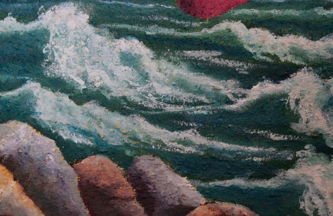 A questo dono notturno ho aggiunto una camicia rossa, con tante mezze lune gialle dipinte, appesa ad un ramo e la mano destra lascia cadere una foglia, lasciandole libera caduta in terra o in mare. Il braccio sinistro accenna un saluto fraterno a sorella Luna. L’albero è ben saldato nel terreno e i massi sono la sua barriera naturale. Il mare possente ed agitato intona il suo canto in questa notte lunatica.