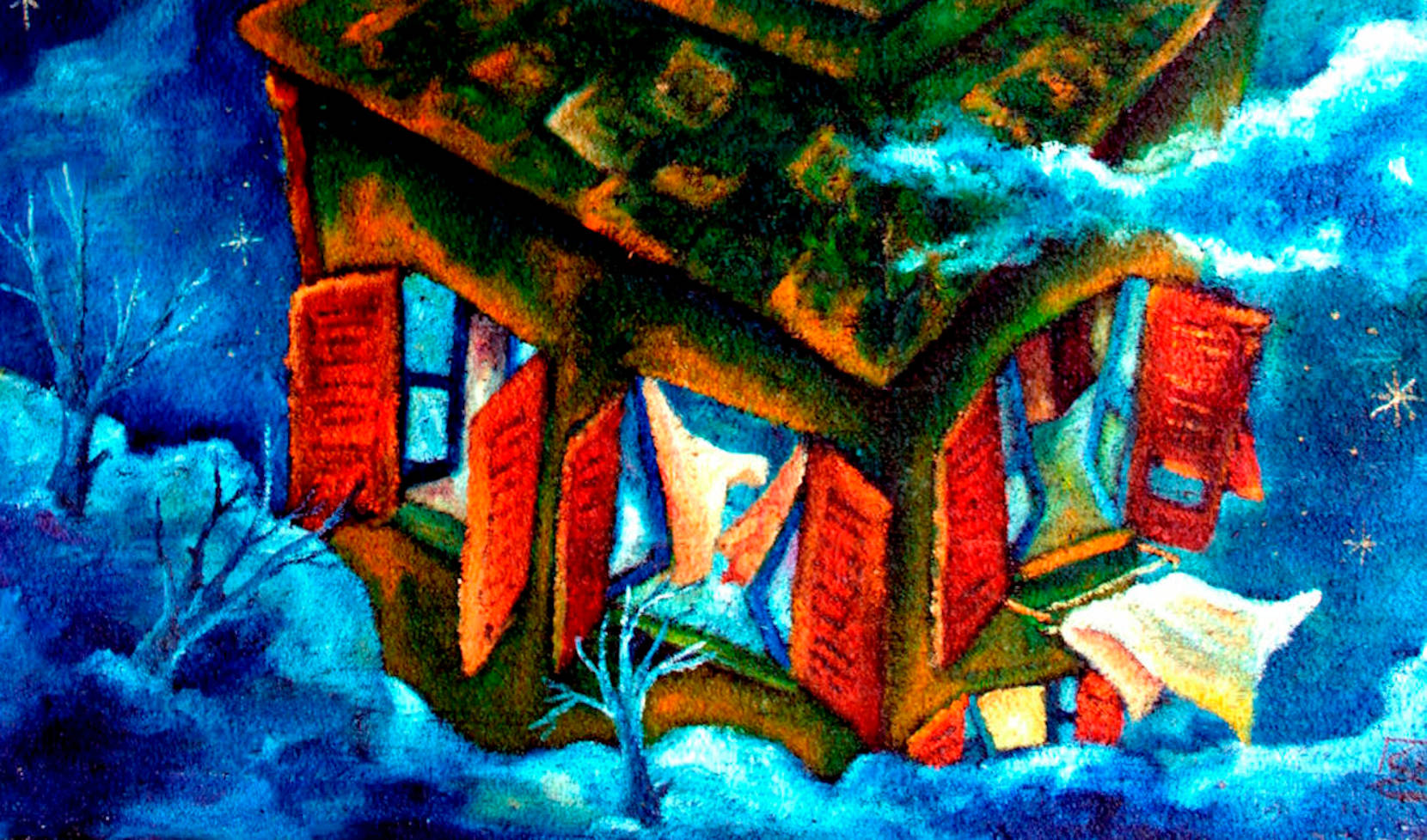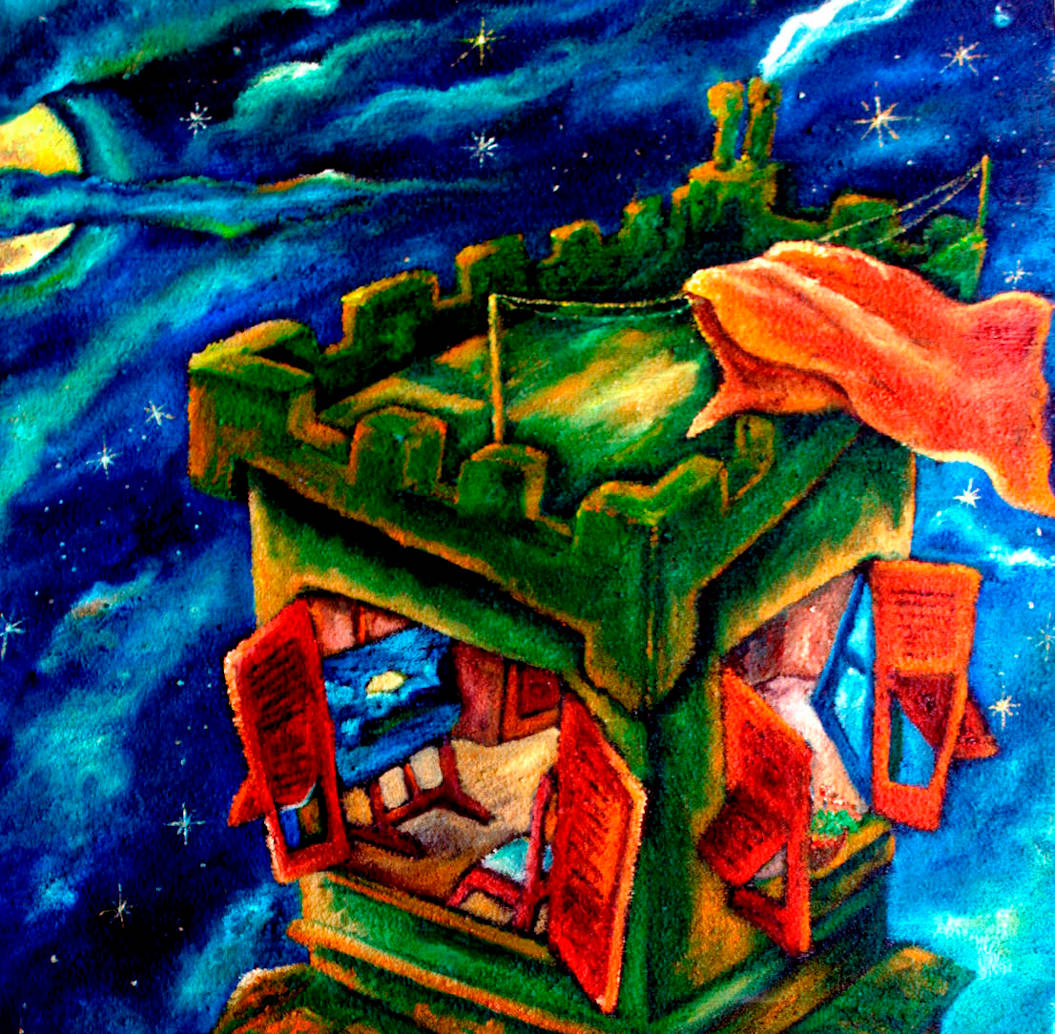 Il mio dipinto è molto più allegro e rappresenta questa casa/torre che si erge dalle nebbie sottostanti ,per farsi “illuminare” dalla luna capricciosa fra le nuvole.