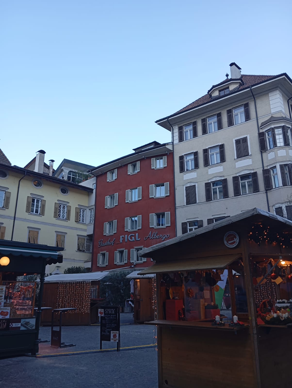 In piazza Walther, in cui troneggia un’enorme albero di Natale, sono allestite le classiche casette di legno,