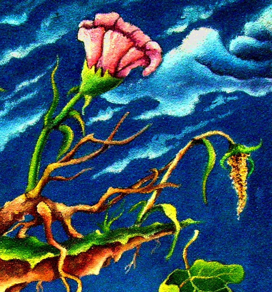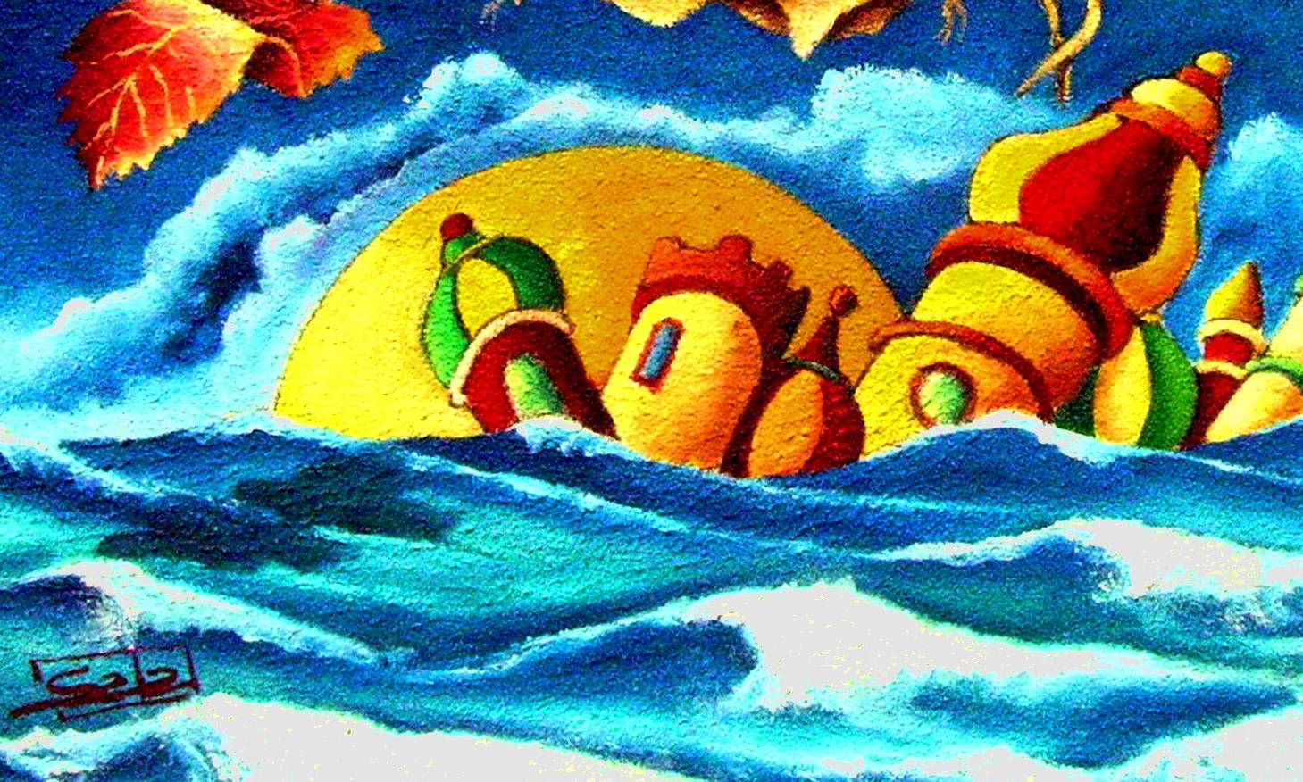 Un mare molto mosso con grandi ombre ha quasi inondato il pianeta Terra ,infatti all’orizzonte la città (con le classiche strutture architettoniche che accorpano edifici di differenti stili) è pronta ad essere “ingoiata”, l’estinzione è imminente. Ma c’è un lembo di terra che ha preso il “vento in poppa”, si è alzato e con forza di positiva di continuità e con fede e speranza ,sopravvive. Come “un’isola che c’è” porta in salvo le canne, che a diversità della quercia che può spezzarsi, esse si piegano (uomo/donna), il fiore che annuncia la vita (leggi stagioni) con colore e profumo e la spiga di farro il più antico alimento dell’uomo. Questi elementi rappresentati sono la speranza e la continuità della vita sul nostro pianeta.
