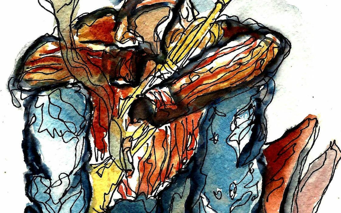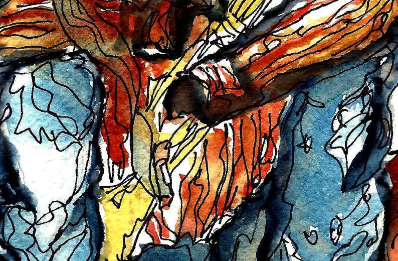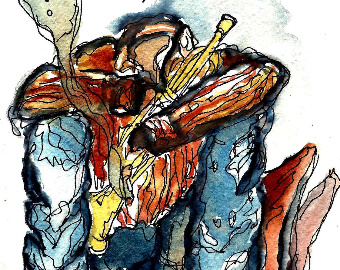 In questo acquarello ho aggiunto una tecnica “bagnato su bagnato”… i contorni della figura sono stati eseguiti su carta bagnata e con estrema velocità è stato steso il colore, permettendo di creare un effetto di aura ,che circonda il maestro.