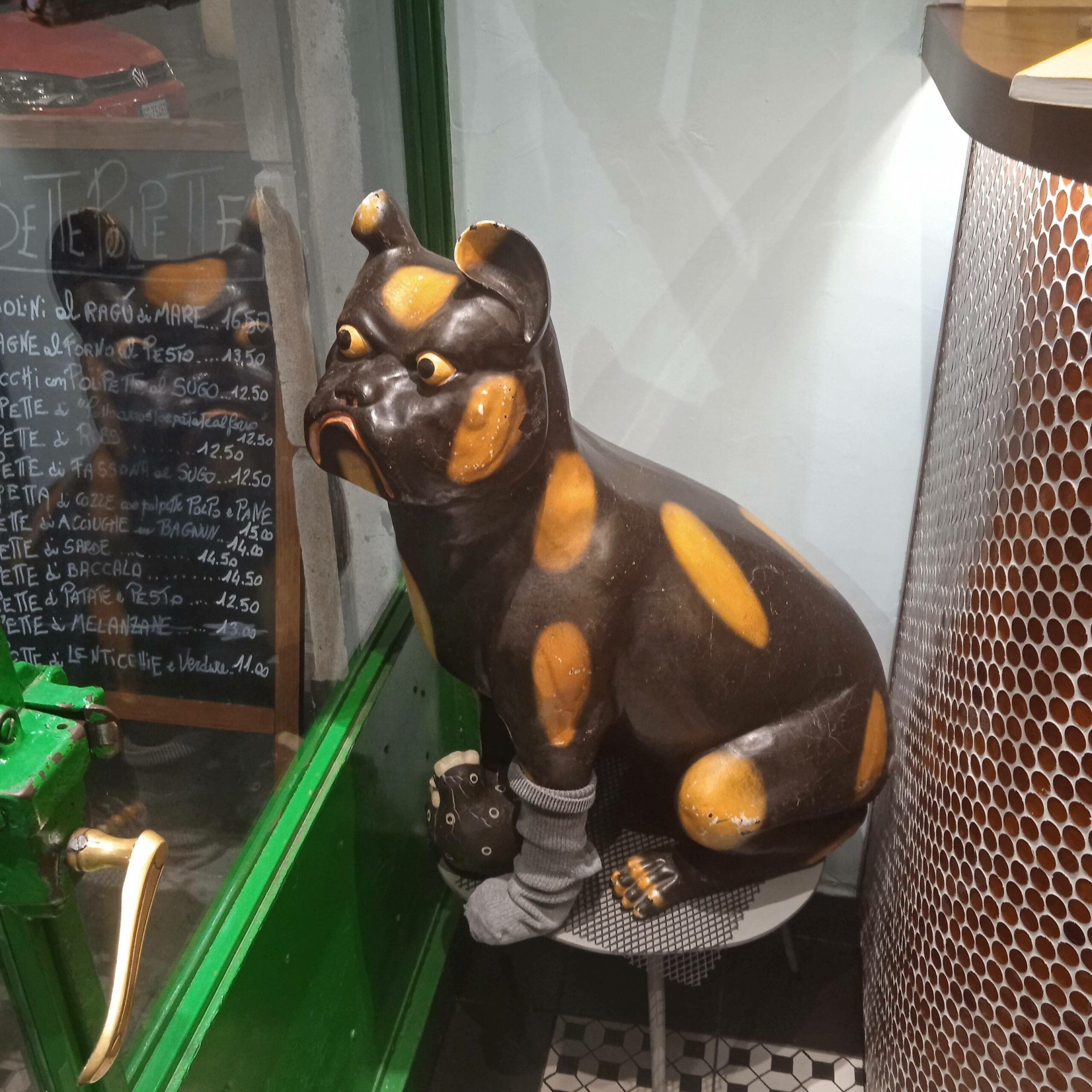 Mi confida che SETTEPOLPETTE è il cane di ceramica, posto in vetrina. Alla veneranda età di circa due secoli, dopo una vita piena, ha abbandonato Macao e ha cercato un luogo tranquillo ,per aprire una sua attività..Ho portato con sé i migliori amici, come aiuti, la signorina Bag, una tigre, un cuoco di strada di Bangkok e un cucù,, ma in realtà fanno solo tanto” bordello di notte”, mangiando a più non posso, senza produrre nulla.