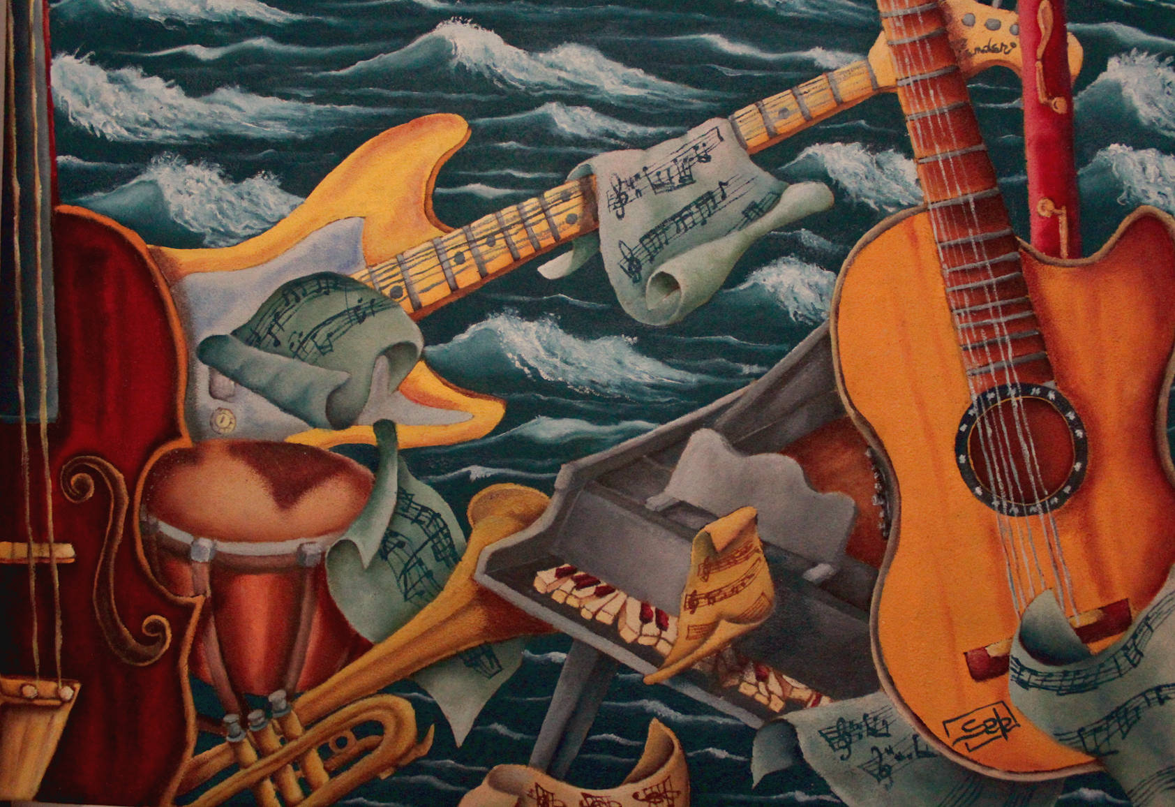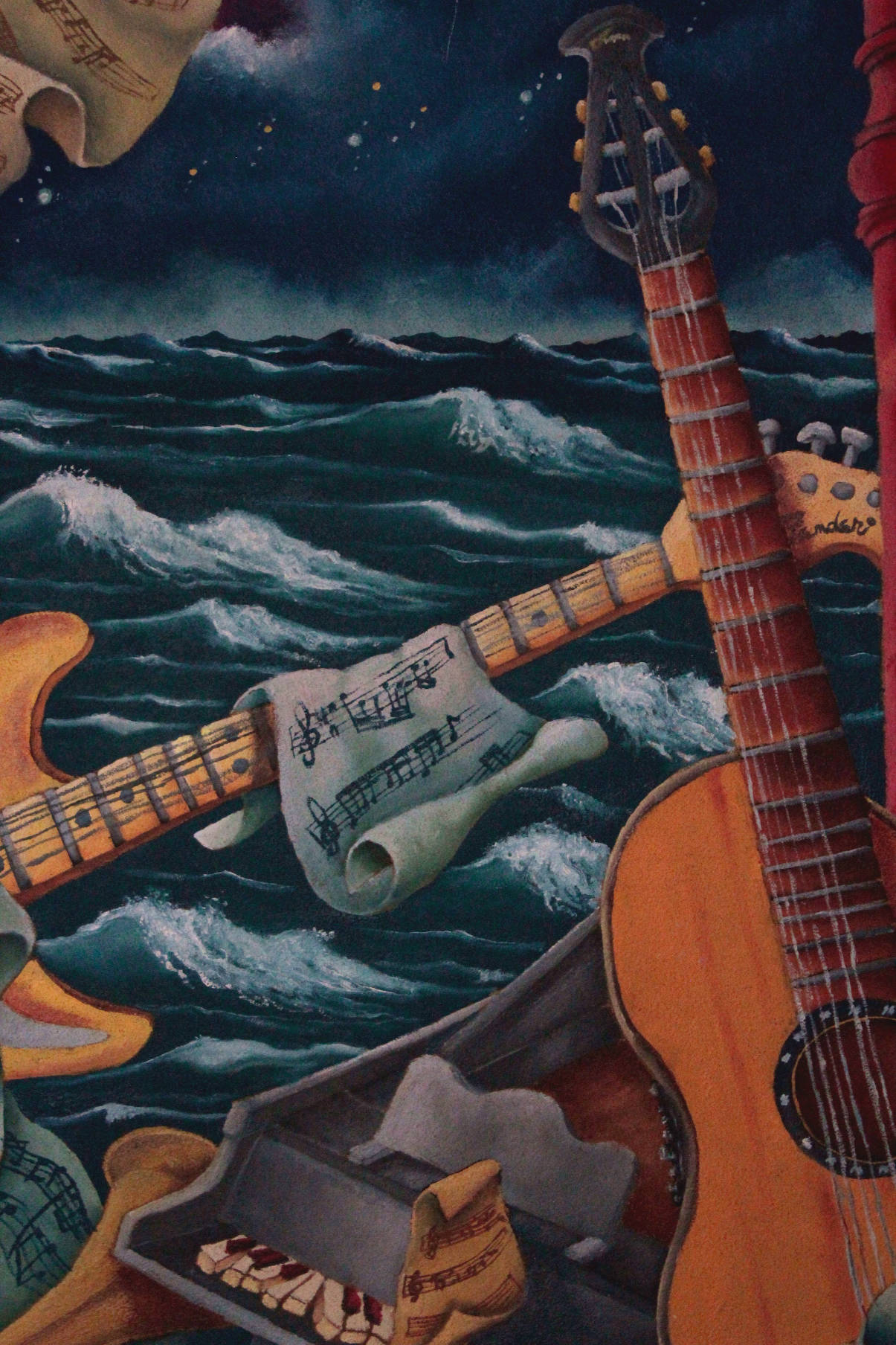 Il suddetto pianeta è ricco di strumenti musicali, alcuni non convenzionali come il timpano e il flauto barocco (grande basso) color lacca di garanza con le ombre definite da un viola scuro,altri più conosciuti come la chitarra elettrica della nota azienda Fender, la chitarra classica Ovation, un violino dello Stradivari anch’esso laccato in rosso, una tromba semi nascosta dal pianoforte a coda dai toni argentei.
