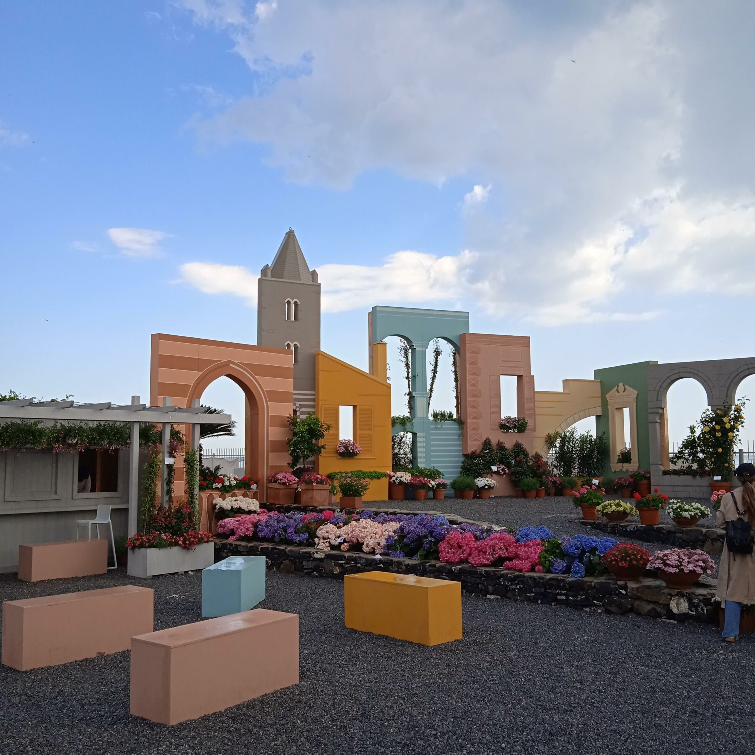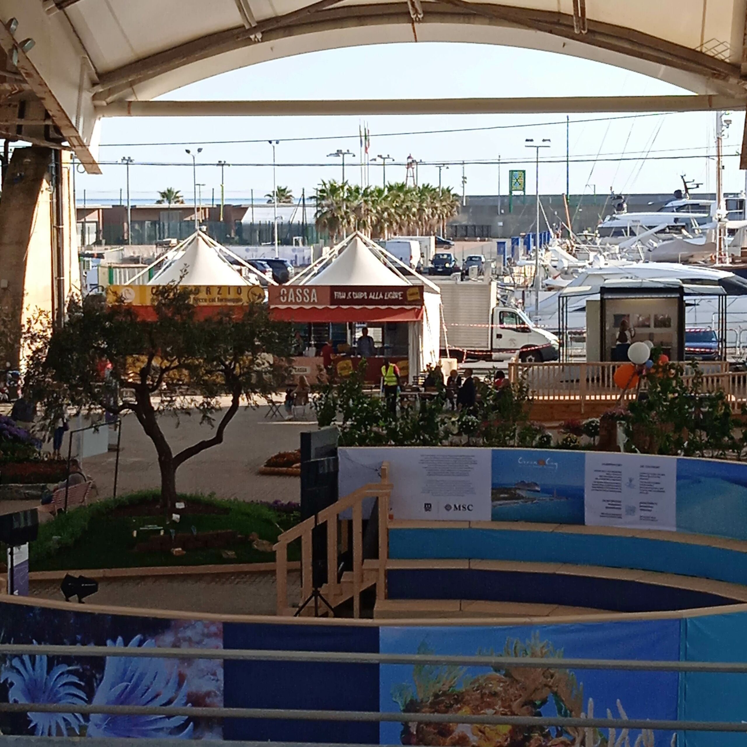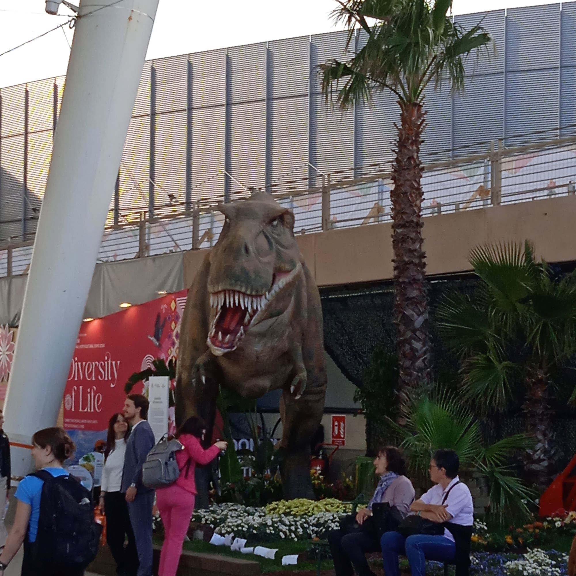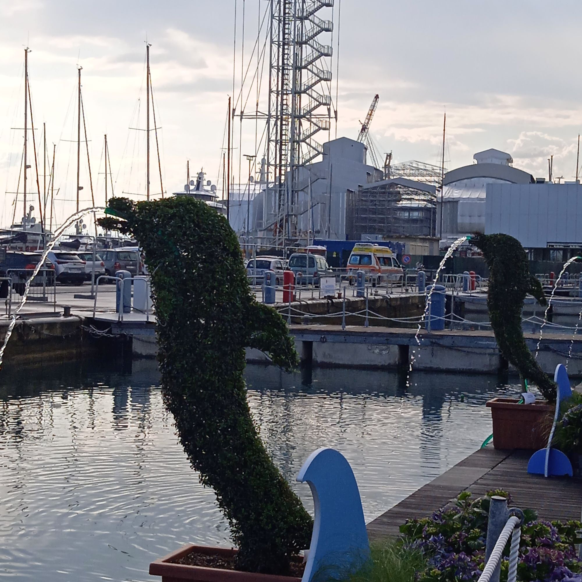Proseguo con il percorso e arrivo alla Marina, dove mi incuriosiscono due dinosauri, versione gigante, inseriti in un contesto fiorito… Piante e fiori si alternano e non sai veramente da dove iniziare, per evitare di perdere qualcosa..una passerella con delfini a fontana mi porta al Padiglione blu..