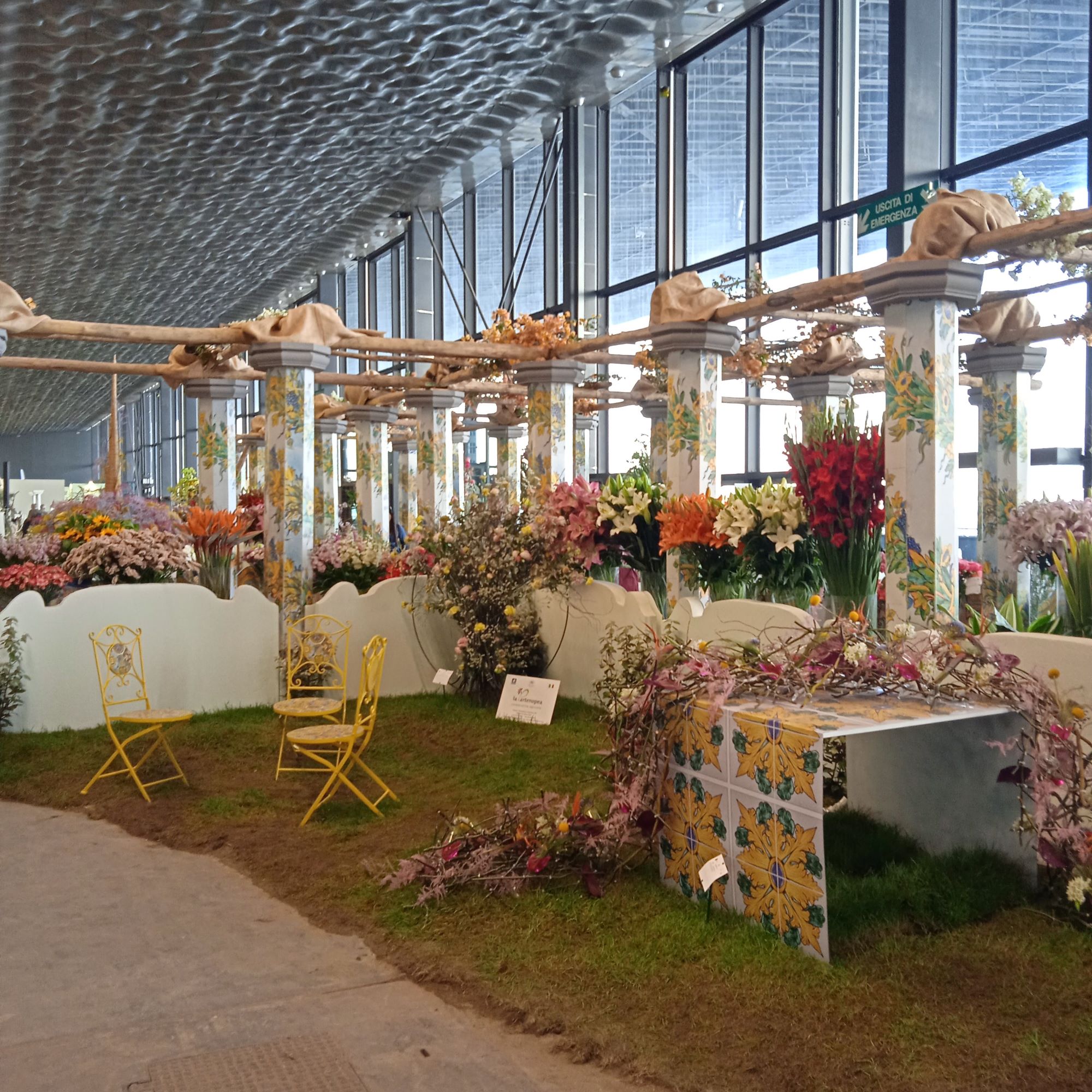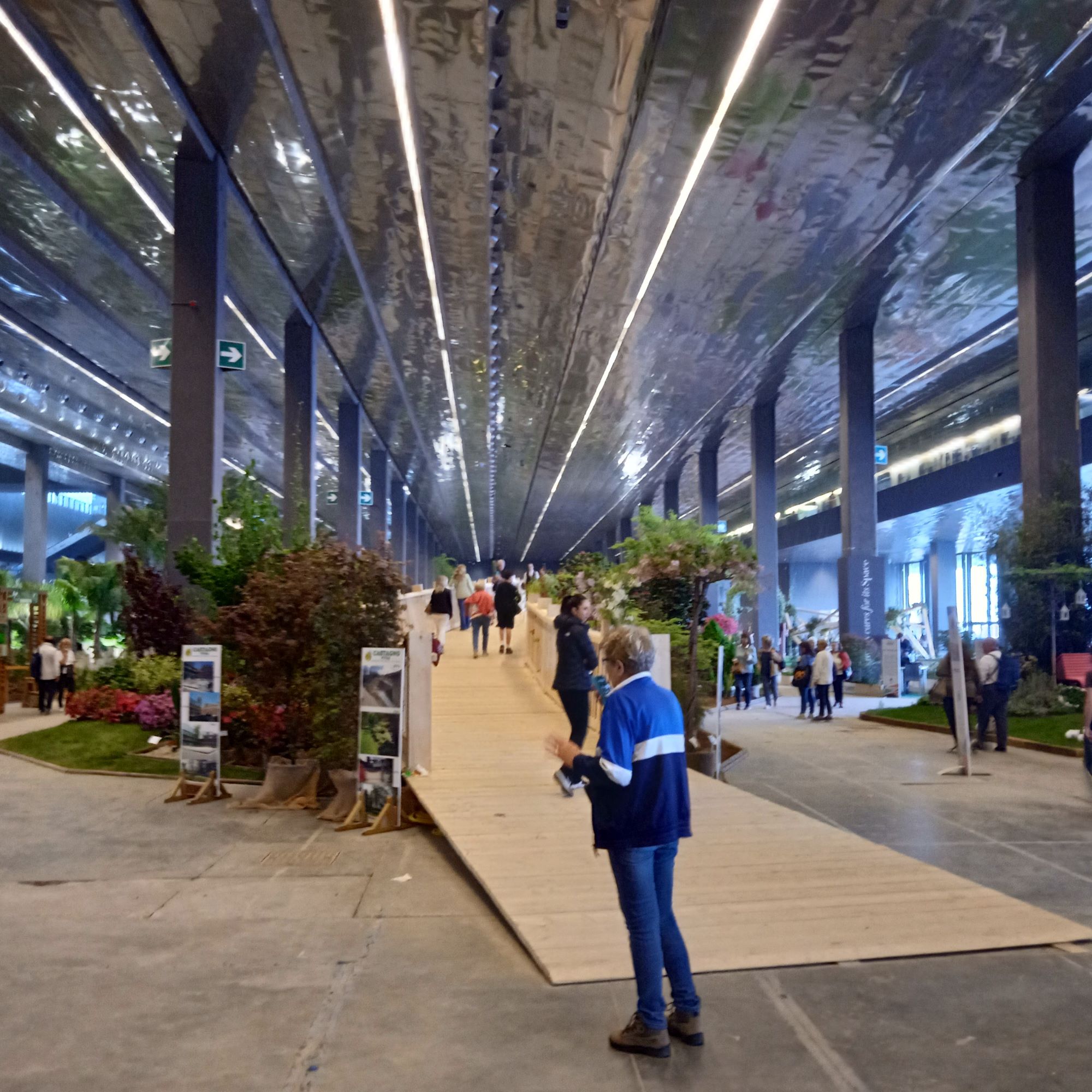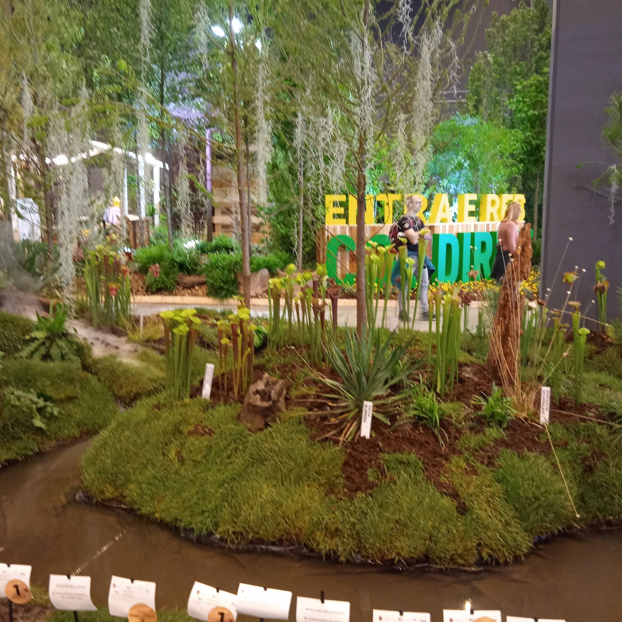 Dopo il piazzale le indicazioni ti portano proprio qui e mi guardo intorno.. L’esposizione è molto curata, ma sono un po’ delusa. Mi ricordo l’emozione provata nell’entrare al Palasport in una delle precedenti edizioni, quando era stato trasformato in un’enorme foresta con tanto di cascata….Oggi ci sono delle “composizioni” separate da paratie ,che riproducono un canneto, molto innovative, ma ,a mio parere ,troppo “fredde”…