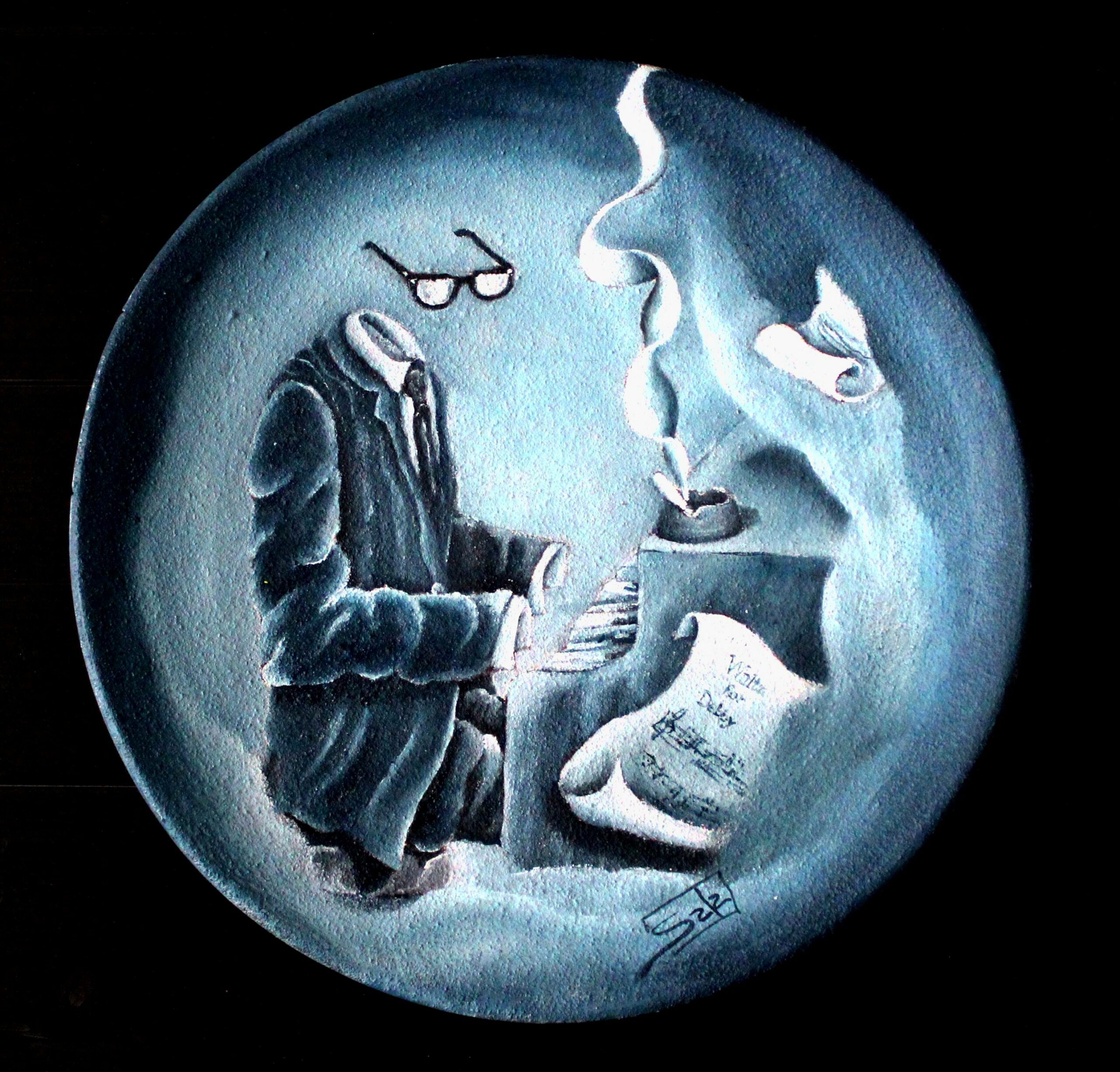 Verso il 2013 mi avvicinai alla ceramica pur mantenendo il mio segno o meglio il mio linguaggio artistico, essendo vicino ad Albissola, ridente cittadina ponentina ,famosa in tutto il mondo per la ceramica, in particolare quella “BLU” (piatti, vasi ed affini sono dipinti con il colore citato). E’ stata un’esperienza interessante ,perché conobbi eccelsi artisti e laboratori/botteghe, ove poter lavorare e cuocere la ceramica. Creai sculture che raffigurano/rappresentano, ma che strano direte voi, “camicie” come del resto una parte del mio lavoro pittorico. Nulla mi feci mancare, perché dipinsi piatti sia tondi che rettangolari di varie dimensioni. Non nascondo che ebbi delle piacevoli soddisfazioni e vendite. Alcuni piatti in terracotta sono stati eseguiti con l’imprimitura in sabbia e dipinti ad olio senza passare alla cottura in forno… un vezzo? No, fedeltà ed etica professionale.