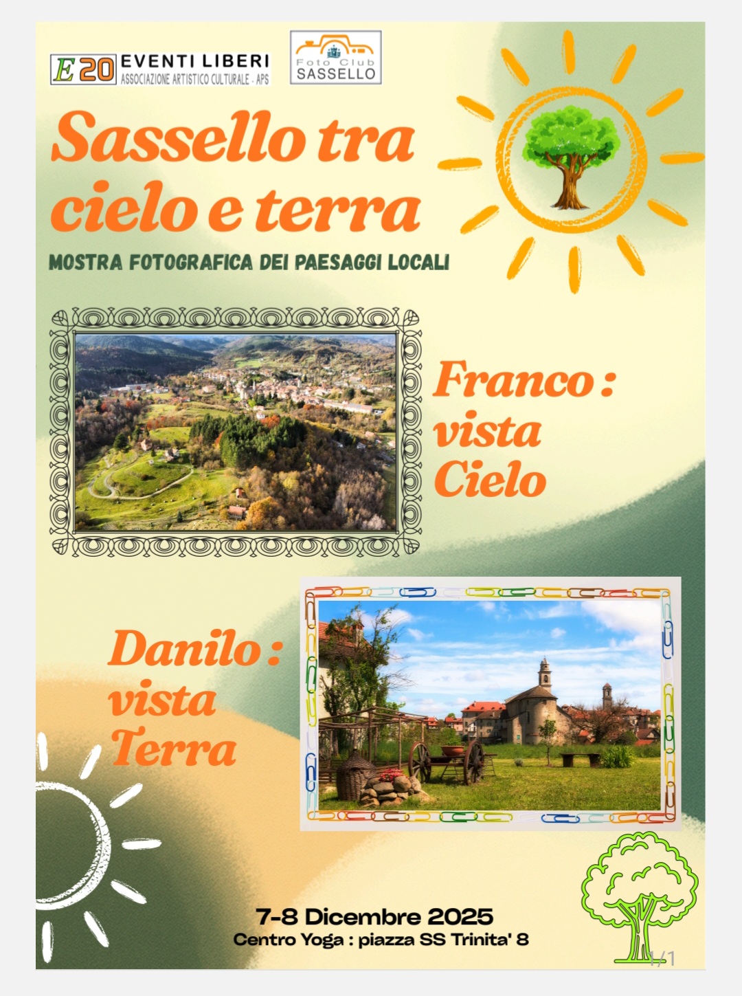Presso l’associazione culturale Eventi Liberi invece sarà visibile la mostra fotografica dal titolo”Sassello tra cielo e terra”, con scatti realizzati dai nostri Danilo e Franco, che vi trasporteranno nel mondo di questo splendido paese, accompagnandovi nella scoperta dei luoghi più suggestivi, immortalati da loro con grande maestria.(la mostra sarà visitabile sia il 7 che 8)