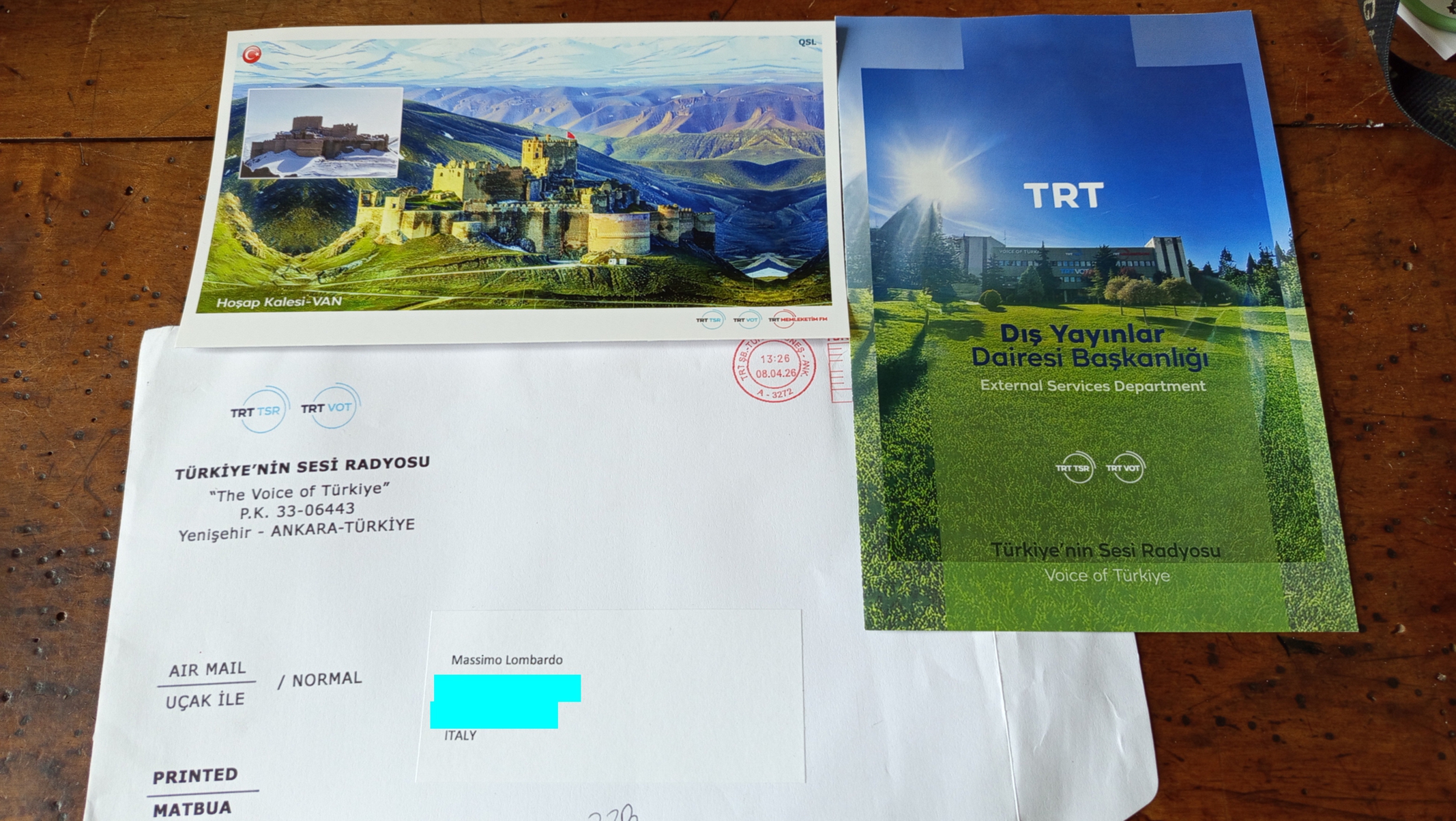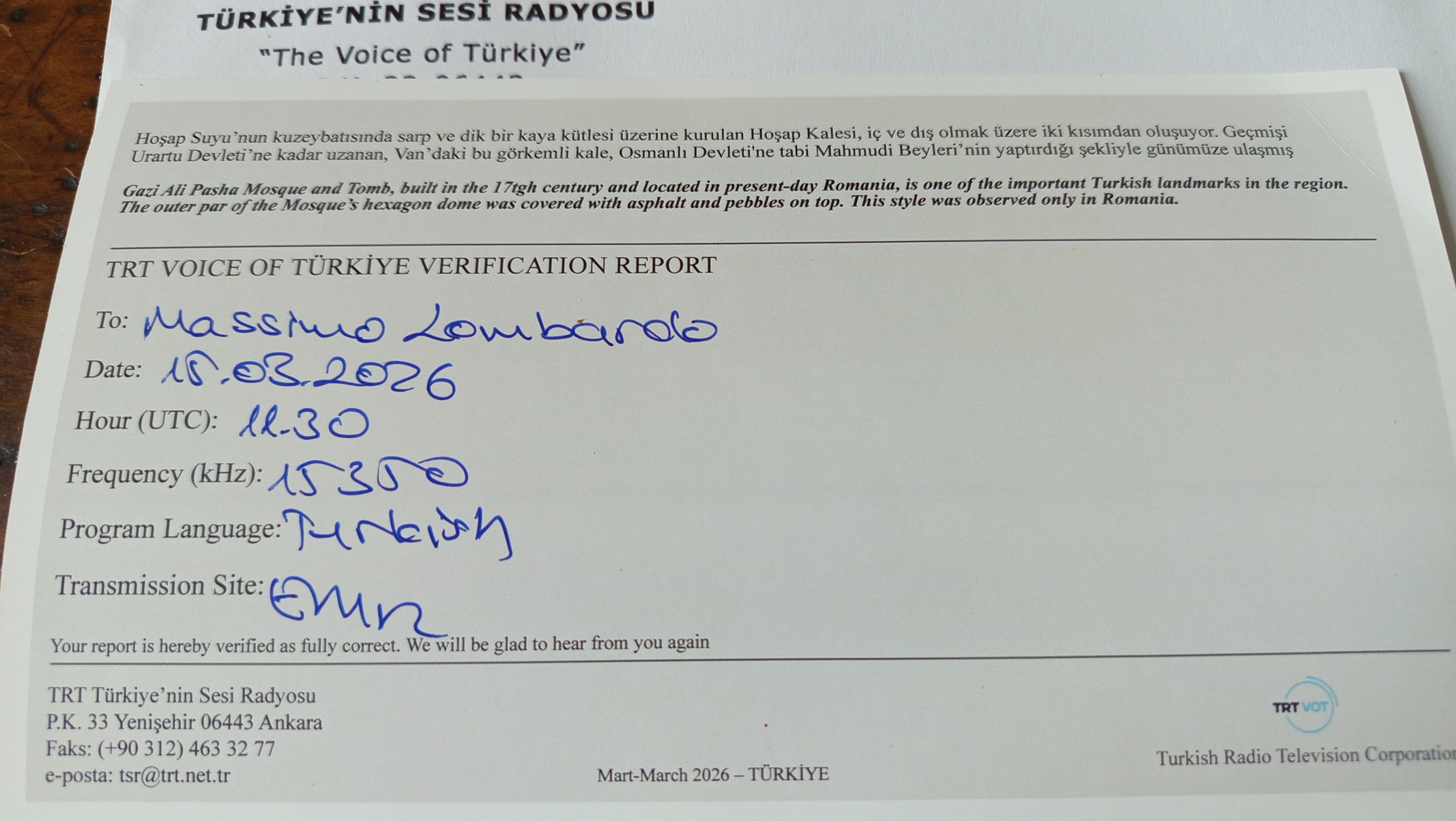 A riprova della ritrovata pulizia elettromagnetica, pubblico l’ultima QSL ricevuta qualche giorno fa. Si tratta di una conferma di ricezione ricevuta da “Voice of Turkey” e , come spesso accade, in allegato ho ricevuto anche il palinsesto dei programmi radio con relative frequenze.